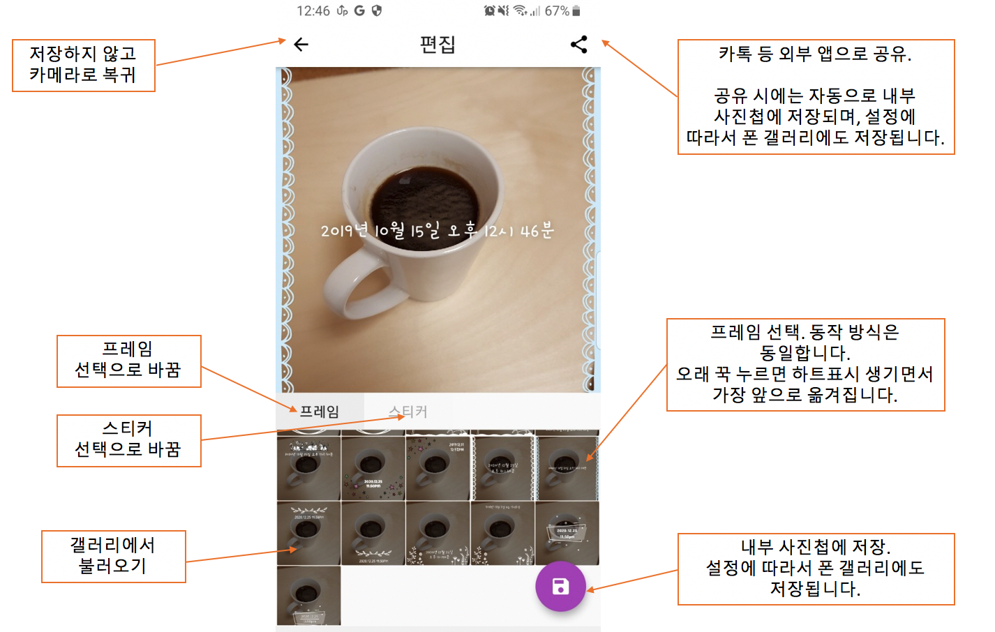 사진을 선택하시거나 촬영하시면 편집화면으로 이동됩니다. 이곳에서는 추가적으로 디자인 변경을 하실 수 있고, 최종적으로 공유나 저장을 하실 수 있습니다.