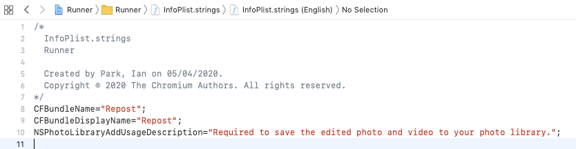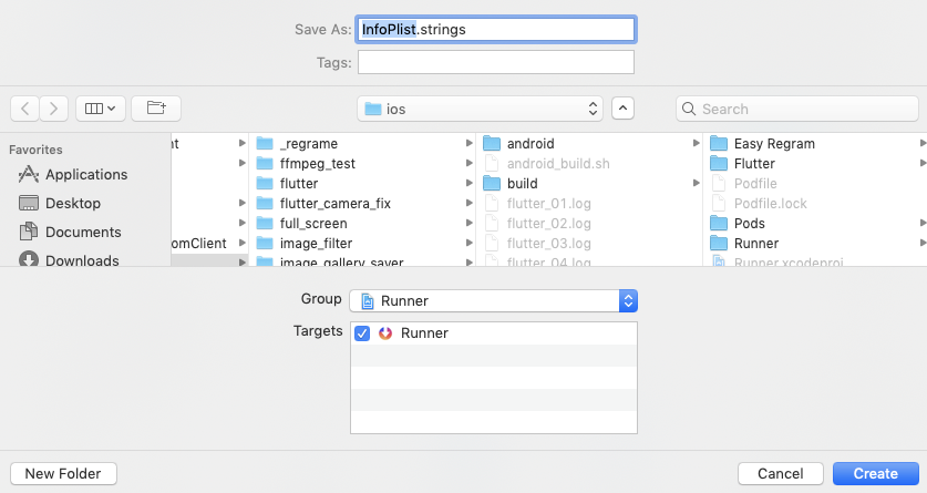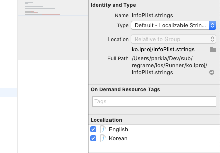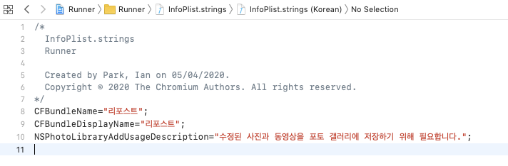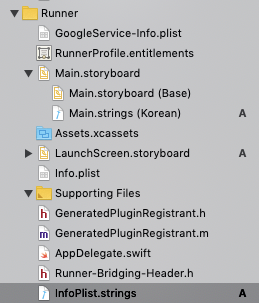 정상적으로 잘 생성이 되었다면 "Runner" 아래에 "InfoPlist.strings" 라는 파일이 생성되어 있는 것을 확인할 수 있습니다.