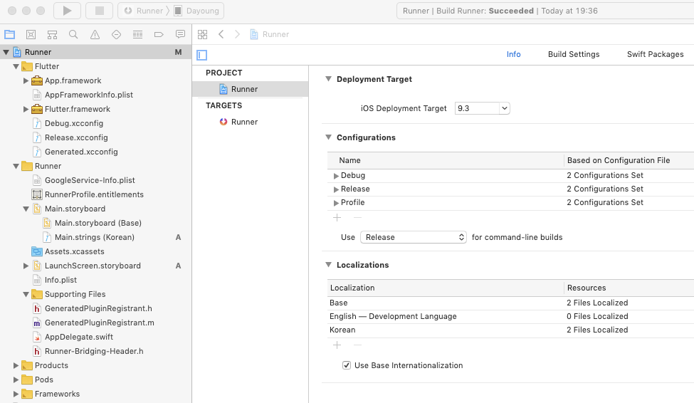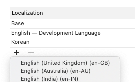 $ open ios/Runner.xcworkspace/그리고 좌측 프로젝트 패널에서 Runner를 선택하고, 중앙의 상세 패널에서 다시 Runner 를 선택합니다. 그러면 하단에 Localizations 라는 메뉴가 있습니다. 여기가 현지화 언어를 등록하는곳입니다.