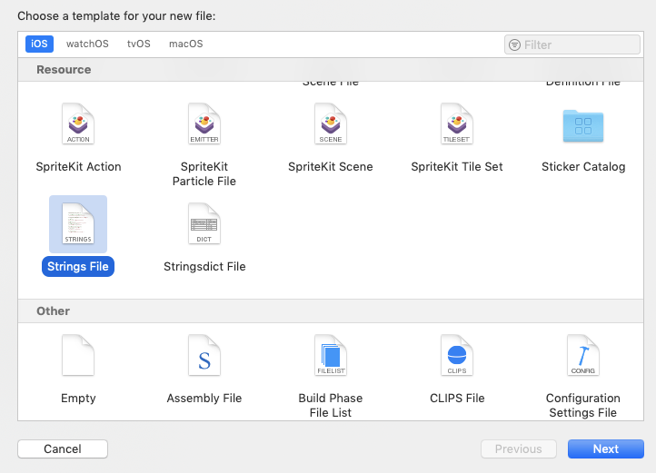 다음과 같은 팝업창이 뜨면, 아래로 조금 만 스크롤 해보면 "Strings File"이 있습니다. 이 항목을 선택하고 "Next"를 클릭합니다.