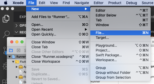 언어를 추가 하였으면, 이제는 현지화를 위한 메타데이타 파일을 추가해야 합니다. 프로젝트 패널에서 내부의 Runner를 선택하신 후 메뉴에서 File > New > File 을 클릭합니다.