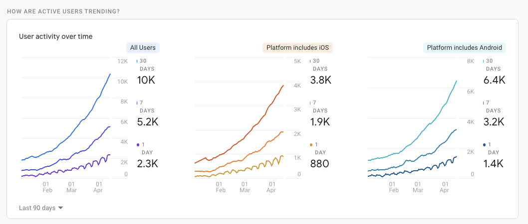 일일 사용자수가 꾸준히 증가하고 있습니다. 2월 초에는 500명, 3월 초에 1000명 정도였고, 4월 초에는 2000명 정도에 도달했습니다. 이대로라면 5월 초에는 4000명이 될까요?
